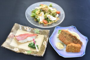 ・金目鯛の塩麴焼き ・西麓野菜と蒸し鶏の中華風サラダ仕立て ・長崎県松浦産アジフライと春かつおのフライ |