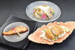| メイン1品選択 | ・銀鮭の西京焼き ・生ハムと西麓野菜のサラダ仕立て ・三元豚のヒレカツ |